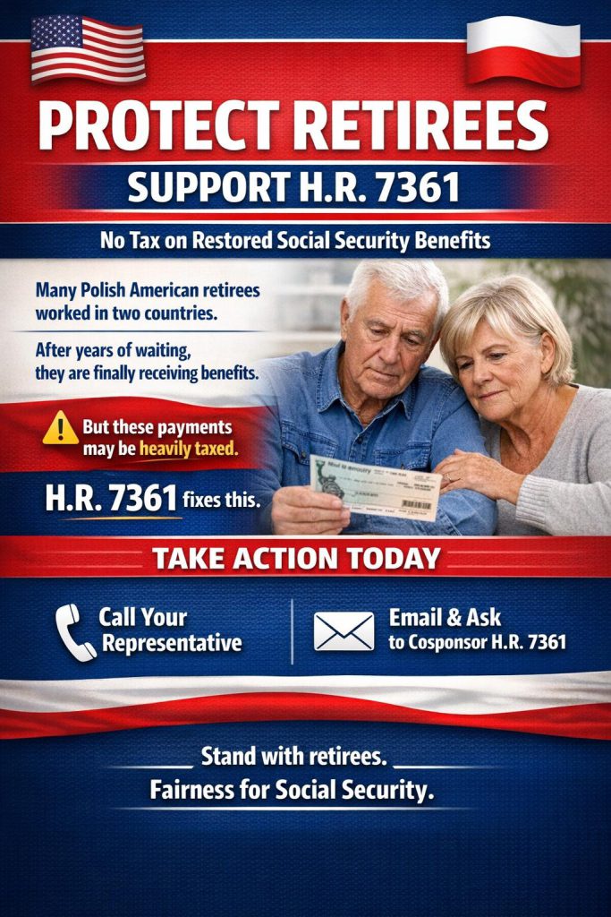 List organizacji PASI stanowi oficjalne poparcie dla projektu ustawy H.R. 7361 („No Tax on Restored Benefits Act”), który ma na celu zniesienie opodatkowania przywróconych świadczeń Social Security dla osób dotkniętych wcześniejszymi regulacjami (WEP).